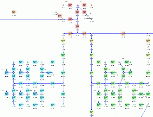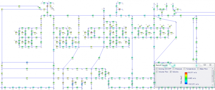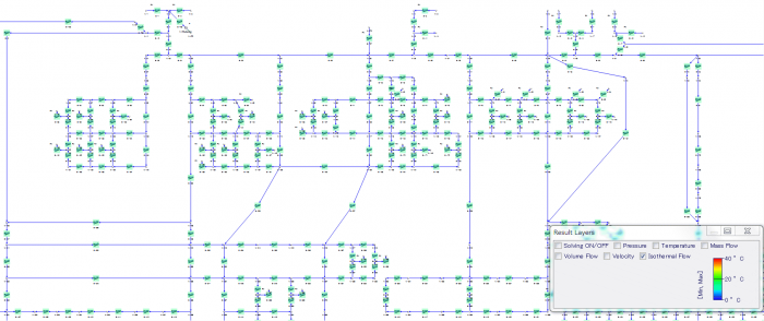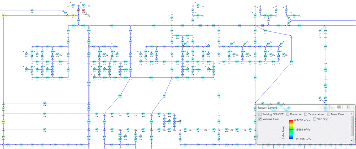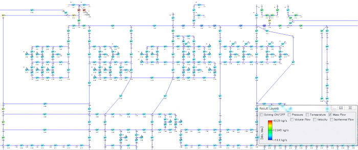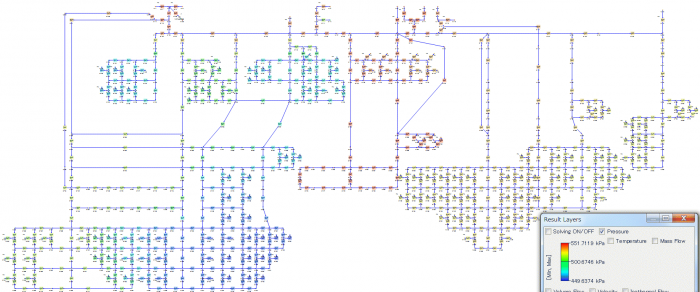 都市ガスネットワークのモデルを示します。Flownexでは大規模なモデルも短時間で計算することができます(このモデルは通常のノートパソコンで約0.9秒)。