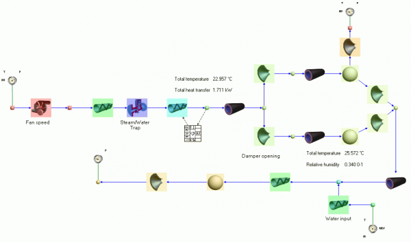 図 2はFlownexの各種コンポーネントにより構築されたHVACシステムの簡易モデルです。この画面でプロパティの設定や最適化などを行ないます。