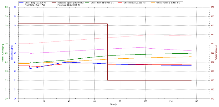 過渡解析によって各部屋の温度と湿度の挙動を観察します(図 4)。