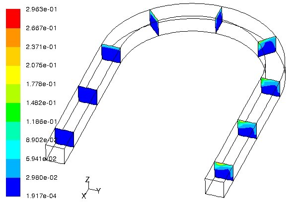 解析結果:ヘリウム気泡濃度分布の流下方向への変化(10等級で気泡径を分級し、離散ポピュレーションバランス法を適用。遠心力、浮力の効果により気泡分布に偏りが生じる)
