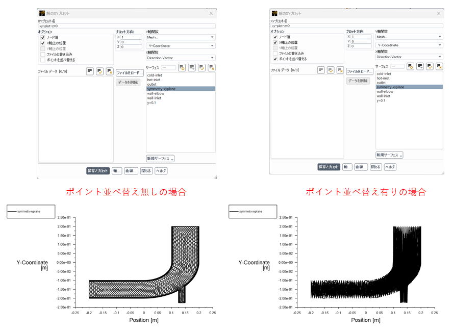 次にfluent内で plot -> xyplot コマンドを使い検査面上のデータ(座標値、出力したい変数値)をファイルに出力します。 $z=0$面については、$x$、$y$座標値、温度値が必要になります。 “節点並べ替え無し”で$z=0$面(symmetry-xyplane面)での$y$座標値を表示すると以下に示すようにメッシュ図が表示されます。 “節点並べ替え有り”の場合は、連続した折れ線として表示されます。 どうやら、この面内における節点座標を対象にして図を作成しているようです。 この面上のデータをファイルに出力します。