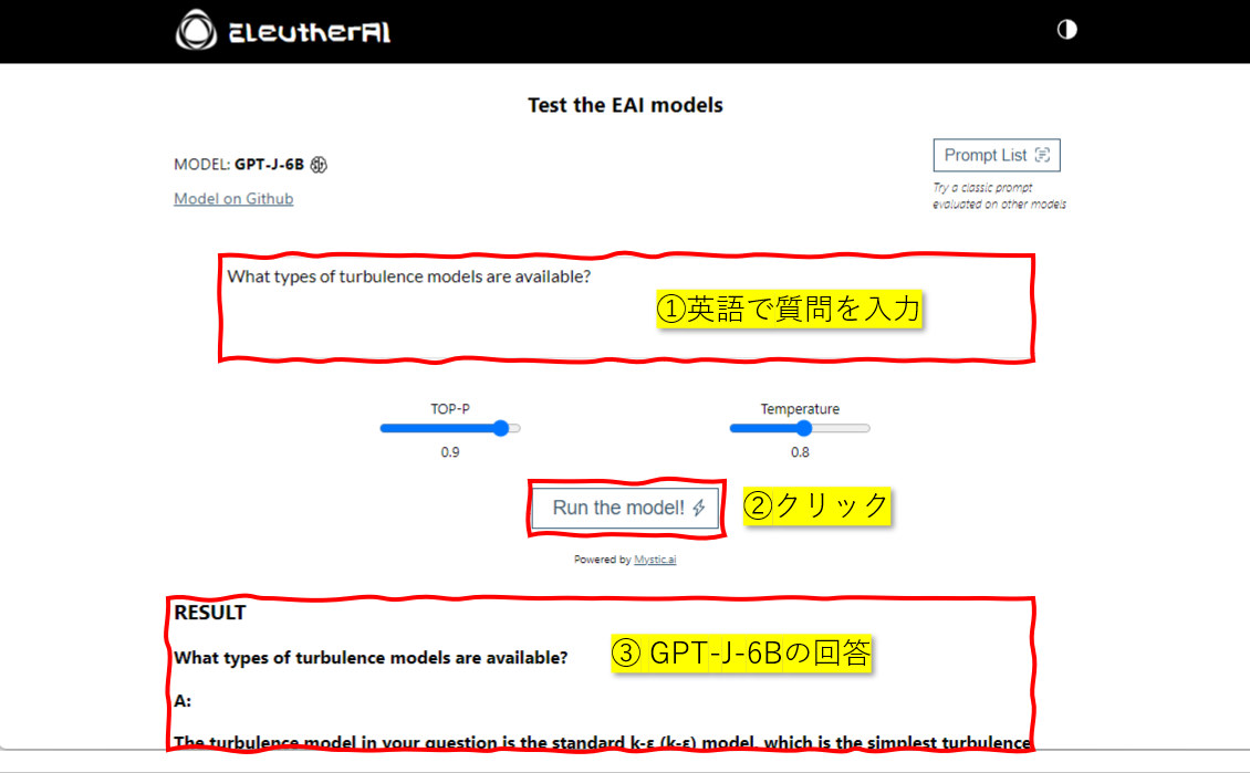 GPT-J-6Bは、日本語にも対応していますが、不自然な日本語を返しますので、 英語で質問した方がよいです。