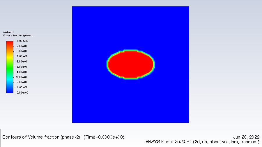 上記の設定を行い,Fluentで初期化すると,液相が楕円形で初期化さます.体積分率のコンター図で赤い部分が液相で,青い部分が気相です.