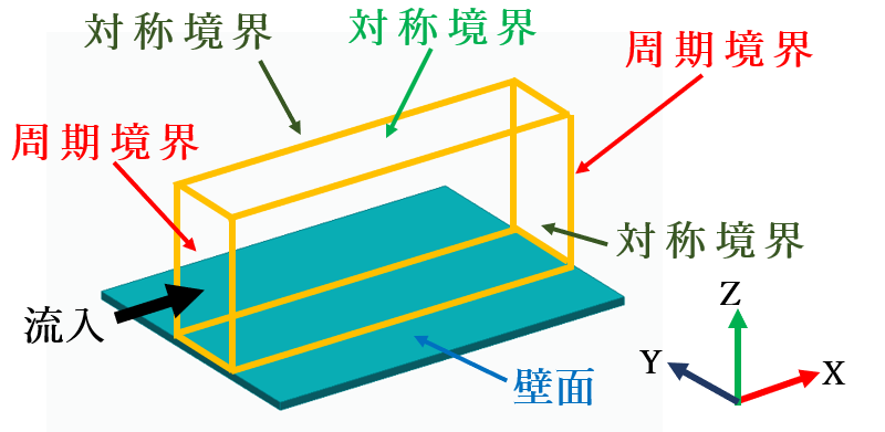 この事例では、摩擦力評価モデル図で示す計算領域を設定し壁面に作用する摩擦力を評価しています。