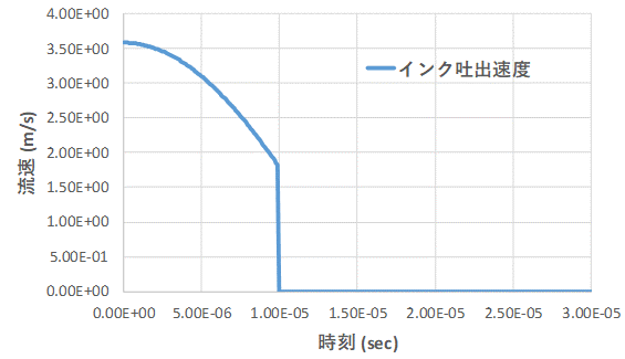 - インクは、インク流入口にユーザー定義関数によりインク速度=$3.58$ m/secで吐出させ、時刻=$10$ μsecで速度=$0$ m/secになるように設定しています。
