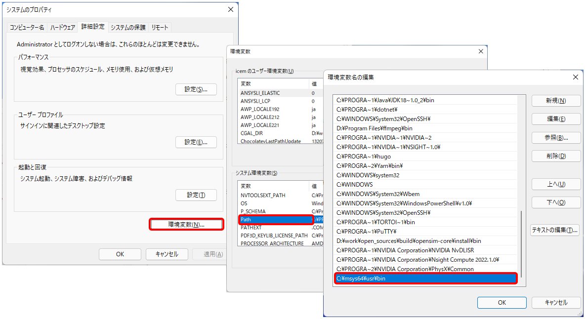 と進み、システム環境変数の中にあるPathに対して、インストールしたMSYS2のbin