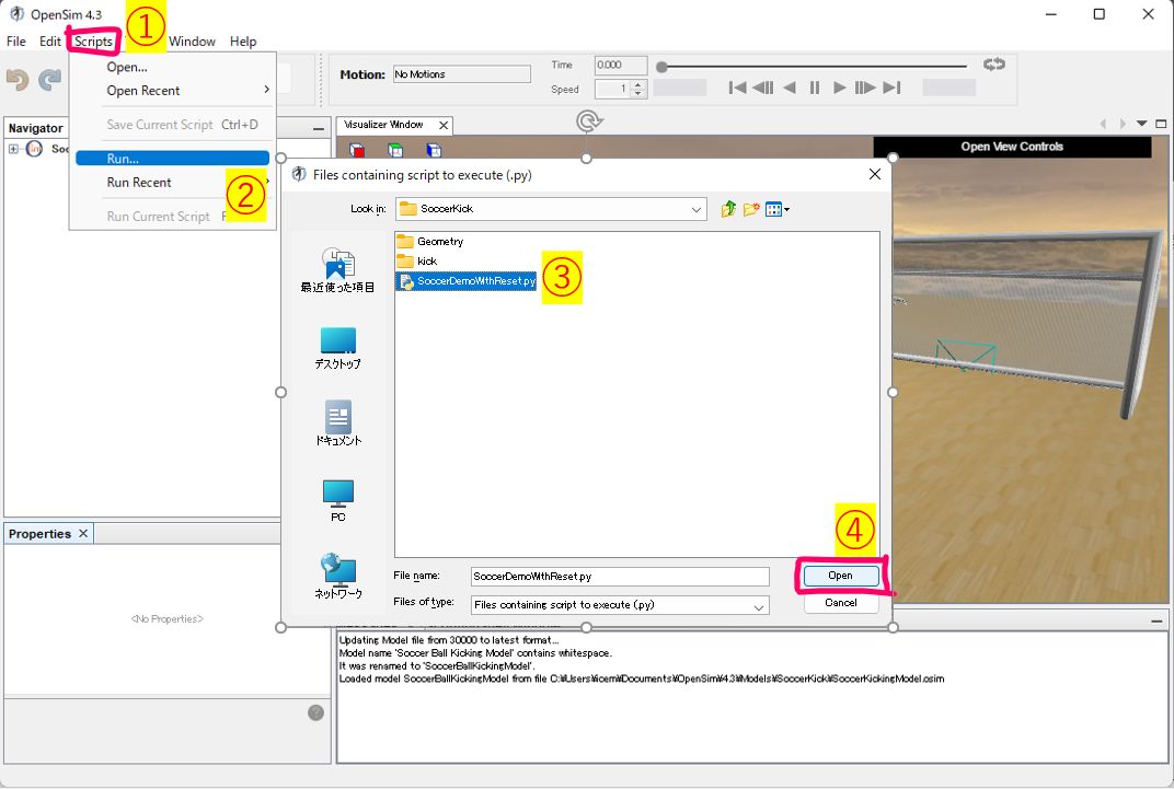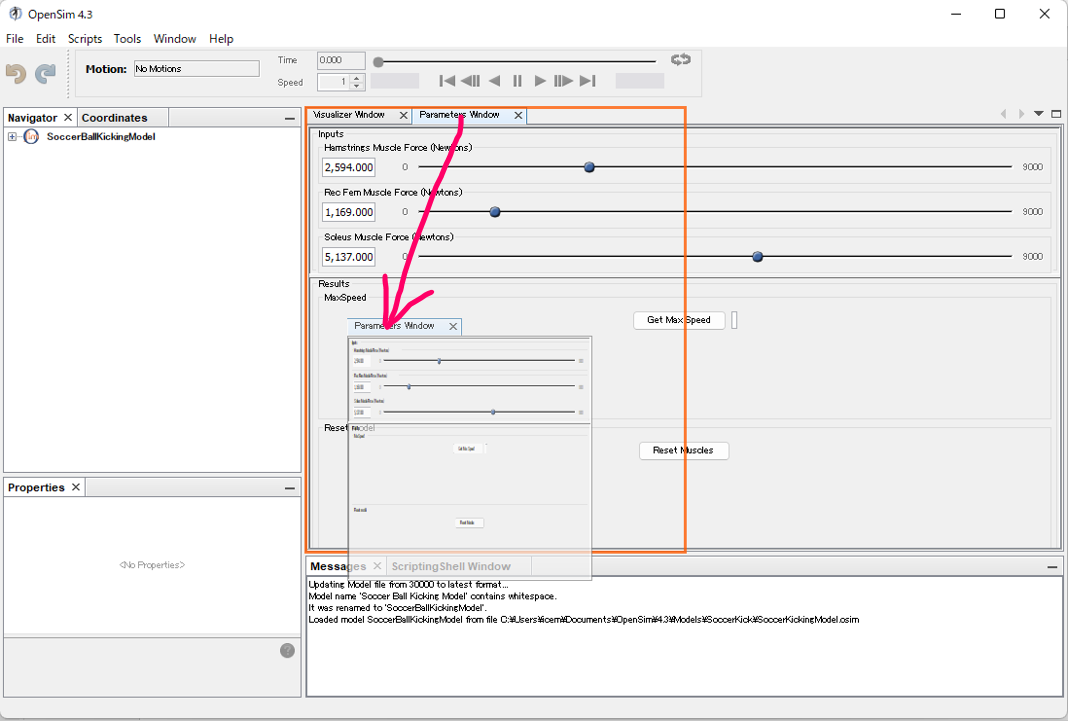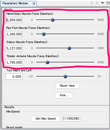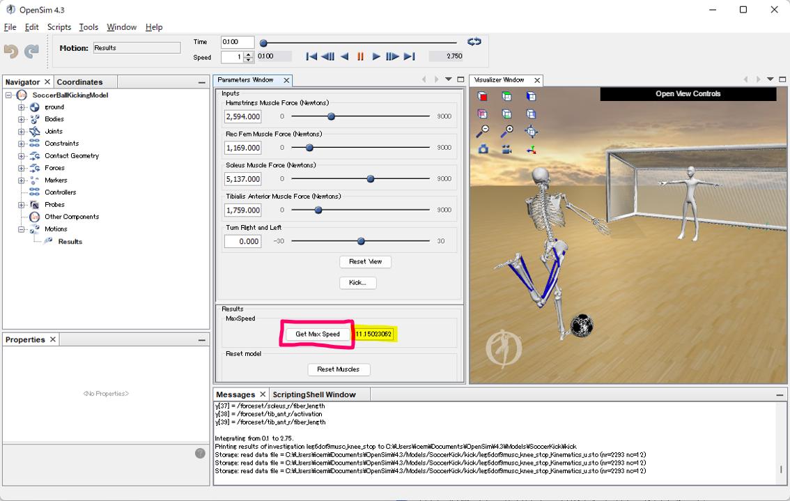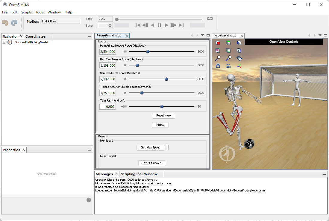 筋骨格モデルにサッカーボールを蹴らせるためのGUIを、PythonスクリプトをRunして、読み込みます。