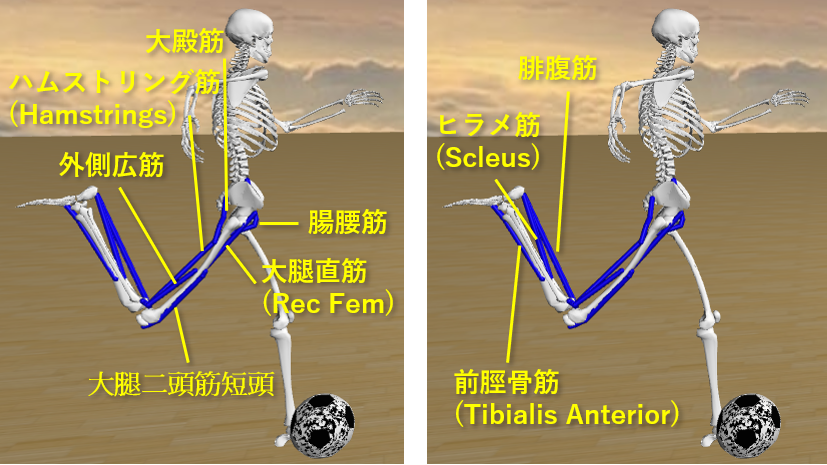指定した筋骨格モデルを描画すると、足に筋肉が付いた骸骨が、正にPKを行う状況となっています。