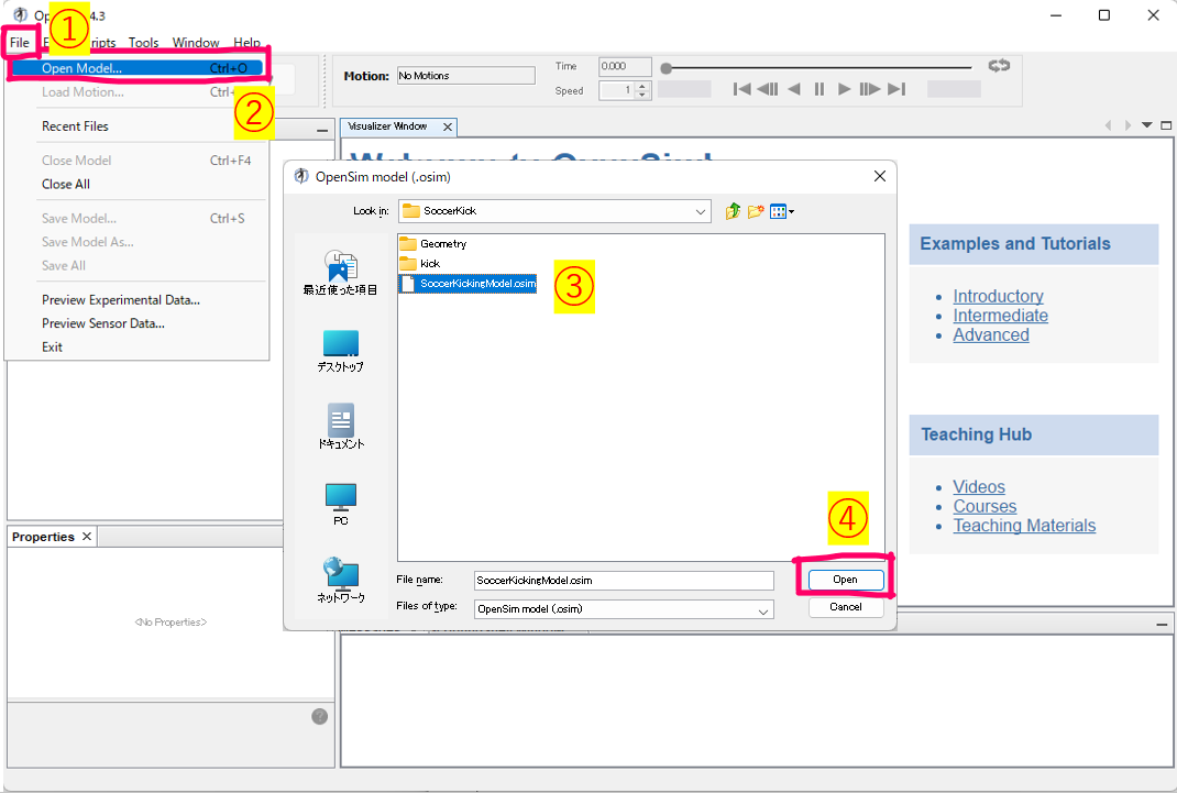 まず、サッカーボールを蹴る例題で使用する「筋骨格モデル」を開きます。