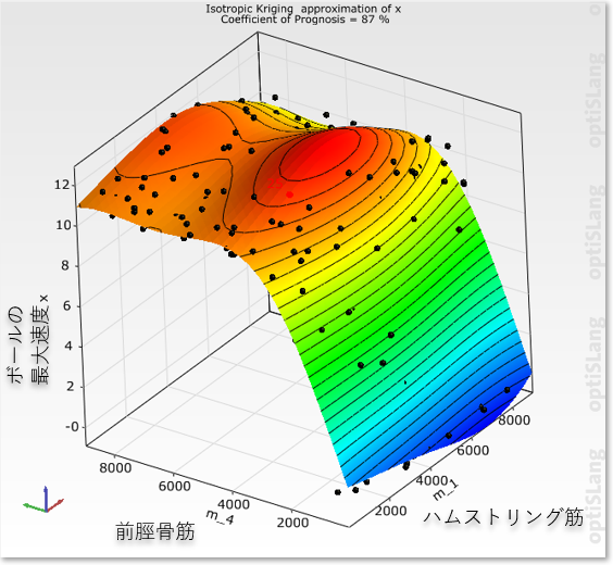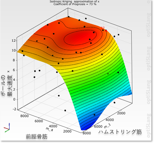 前記事のCMA-ES(共分散行列適応進化戦略)よりもボールの最高速度は遅くなりましたが、 感度解析で得られる分散による貢献度や、MOPやAMOPで模擬されたシミュレーションのモデル応答の曲面を見ると、 「前脛骨筋を鍛えると急激に、ボールを蹴り出すスピードが上昇する」など、より詳細な知見を得られそうに感じました。