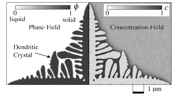 図4は、PF法を用いてAl-Cu合金の凝固のシミュレーションを行った結果です1。