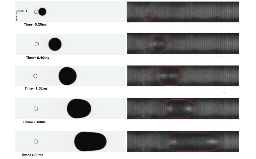左図がシミュレーション結果、右図が実験結果で、シミュレーションにより蒸気泡(黒い部分)が 次第に大きくなっていく過程を再現できていることが分かります。