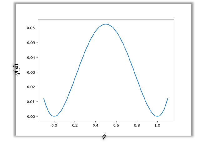 $q(\phi)$の分布は図3のようになり、$\phi = 0.5$で極大値を取り、$\phi = 0, 1$で極小値を取ります。
