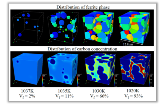 フェライト相がオーステナイト相を侵食しながら成長する過程が再現されています。