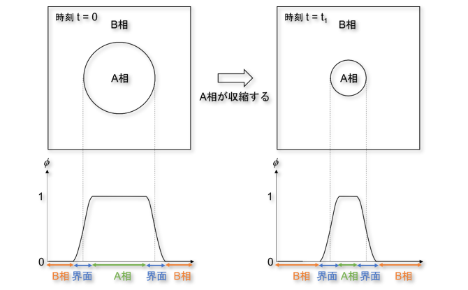 $\phi(\mathbf{r}, t)$はA相の体積分率を表し、A相の中では$\phi(\mathbf{r}, t) = 1$、 B相の中では$\phi(\mathbf{r}, t) = 0$の値を取ります。