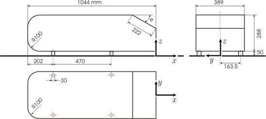 (下図の寸法はmm。参照: Ahmed bodyとか S.R. Ahmed, G. Ramm, Some Salient Features of the Time-Averaged Ground Vehicle Wake, SAE-Paper 840300, 1984)