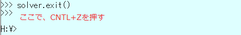 その後コントロール+Zキーを入力するとpythonが終了して、ウインドウズのコマンドプロンプトに戻ってきます。