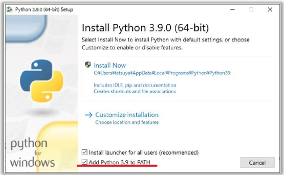 PyFluentでサポートしているバージョンは、python 3.7からpython 3.10ということなので適切なバージョンを以下のURLからダウンロードして インストーラを実行します。なお、コマンドプロンプトからpythonを実行するので、下図に示すようにPATH変数の追加をチェックしておきます。