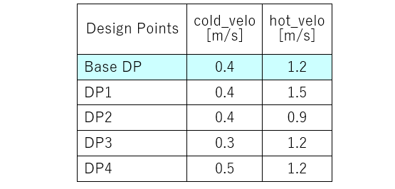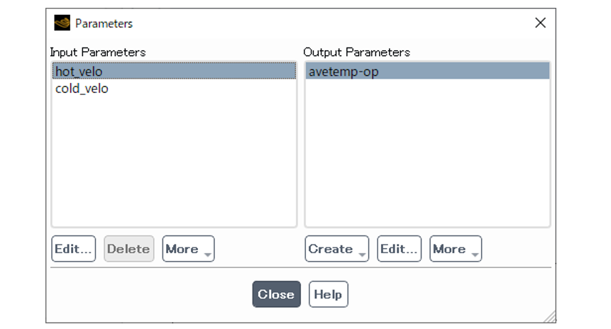 この解析では、高温流体の流入速度(hot_velo)、および低温流体の流入速度(cold_velo)を 入力パラメータとして変化させて、平均流出温度(avetemp)を出力パラメータとして評価します。