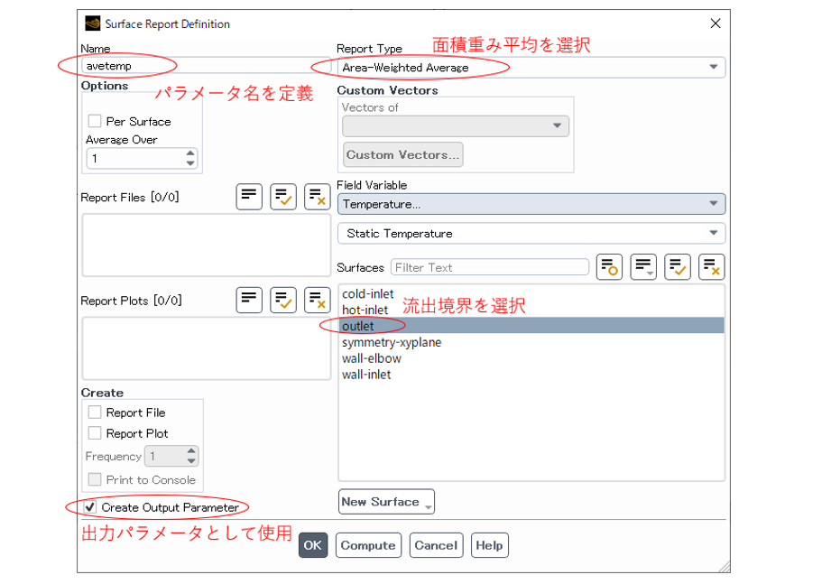 - Solution (リボン) > Definition > New > Surface Report > Area-Weighted Average