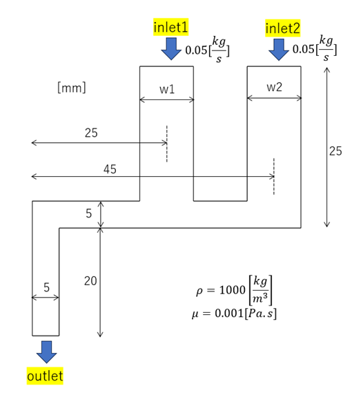 2つの流入口から流入した流体が合流して一個の流出口から流出する流れ場を想定した。 その際に流体エネルギーの損失が最も小さくなるようなケースを求めた。