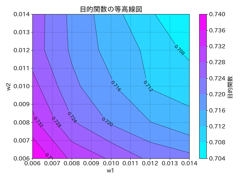 応答曲面(目的関数)のコンター図を作成するために plot_object.pyというpythonスクリプトを実行し、コンター図を作成した。