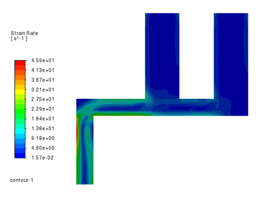 せん断速度コンター(流路幅が小さい箇所でせん断速度大となる)