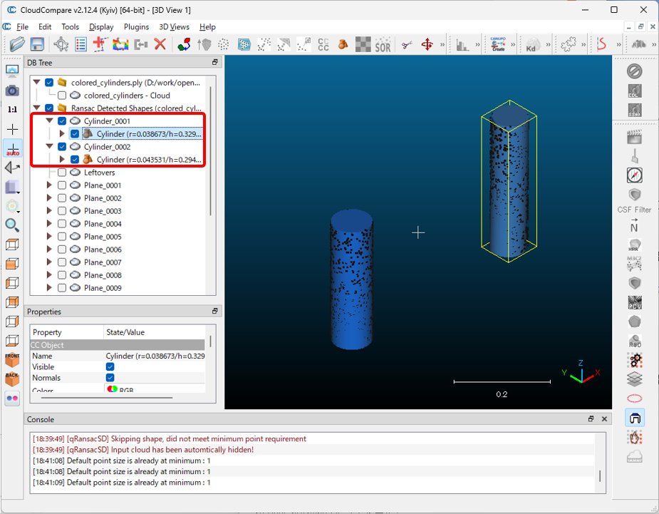 例えば、Cylinderだけを有効にして、ツリーを展開して、形状を有効にすれば、検出された円柱を確認することができます。