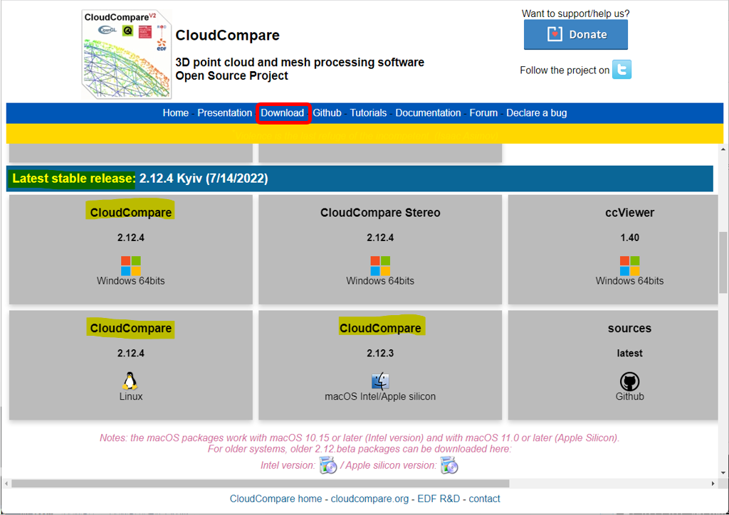 ダウンロードは、CloudCompareのホームページにあるDownloadタブから、ご自身の環境に対応した安定版(Latest stable release)のインストーラーをダウンロードし、インストールします。