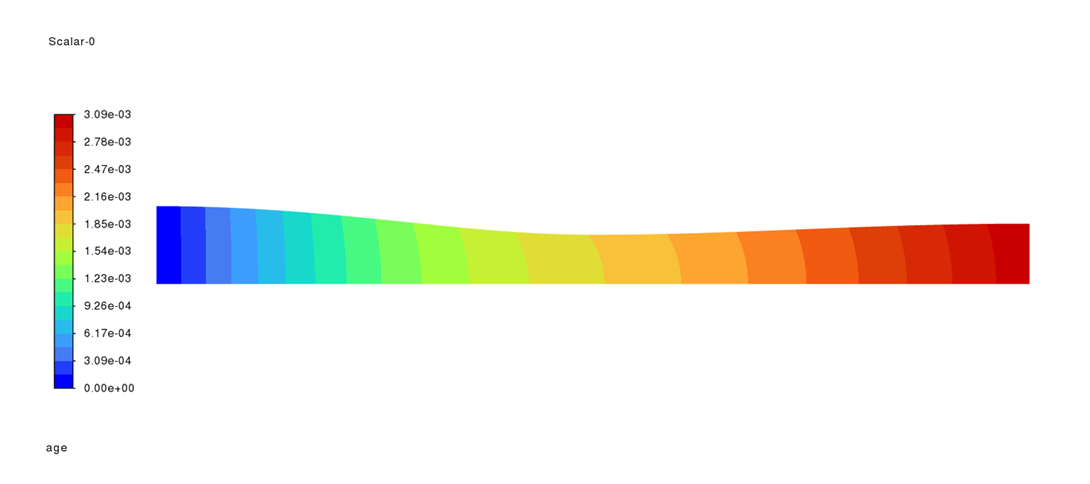 次に、この流れ場を使い、滞留時間の計算を行ってみた。この計算はUDS変数の移流拡散解析である。