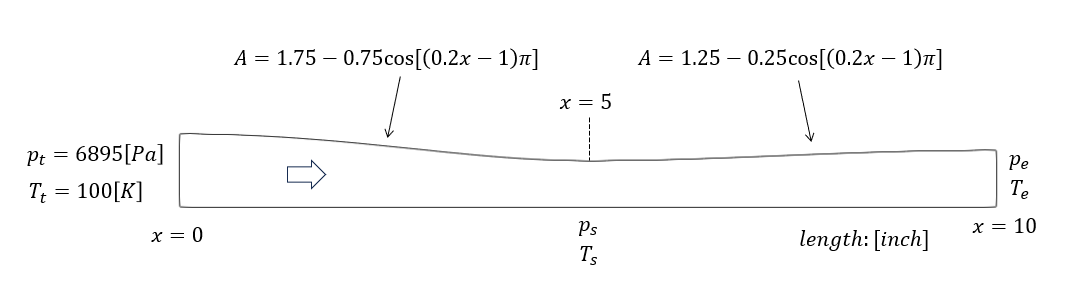 以下に解析モデルの模式図を示す。 ここでは亜音速流れを対象とするため、流出境界圧力を$p_e=0.89*p_t=6137[Pa]$とした。