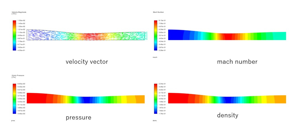 この流れ場では流路面積が小さくなる部分で流速が増大し、密度が減少していることがわかる。