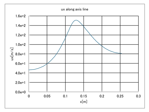 中心軸に沿った軸方向流速(ux)の分布は以下のようになった。