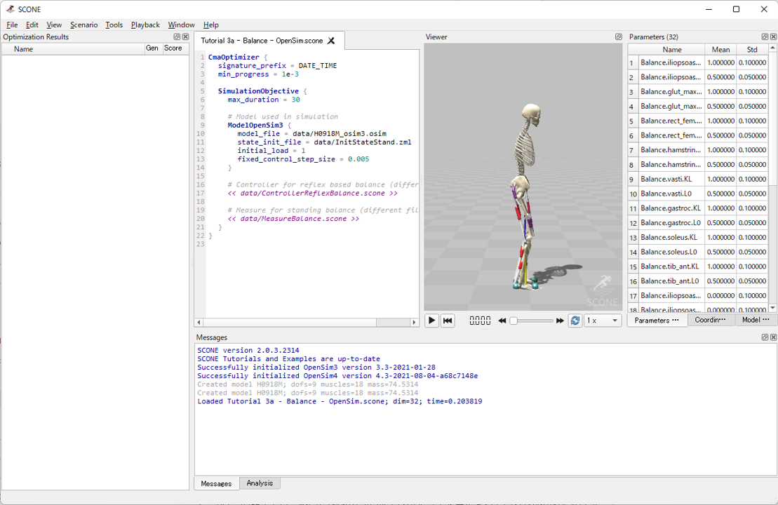 SCONEでは、シナリオファイル(*.scone)を使って、シミュレーションしたい運動を最適化問題として記述します。