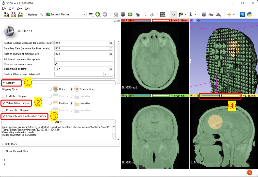 メッシュ生成が終了したら、Displayを展開し、Yellow Slice ClippingとKeep only whole cells when clippingにチェックを入れます。