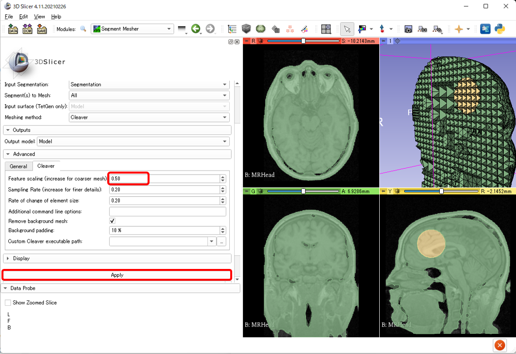 もっと細かいメッシュを作成する場合は、**Feature scaling (increase for coarser mesh)**の値を小さくし(例えば、0.50)、 再度、Applyします。