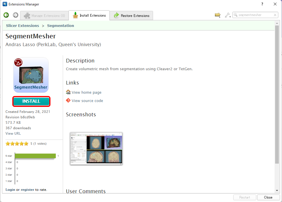下図のように、Install Extensionsタブで、SegmentMesherを検索ボックスに入力し、検索されたSegementMesherをクリックします。