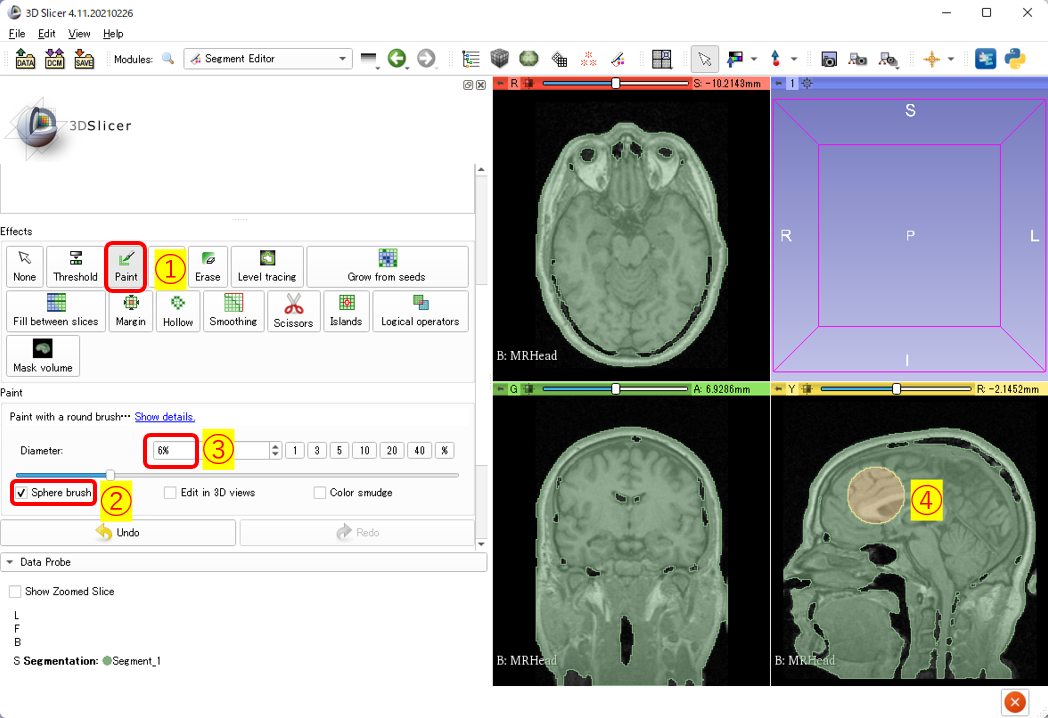 PaintエフェクトのSphere brushを有効にし、球体ブラシを設定します。 球体ブラシの径を**6%**にし、黄色のスライスビューにおいて、頭部の適当な位置をクリックし、病巣を模擬するセグメンテーションを作成します。