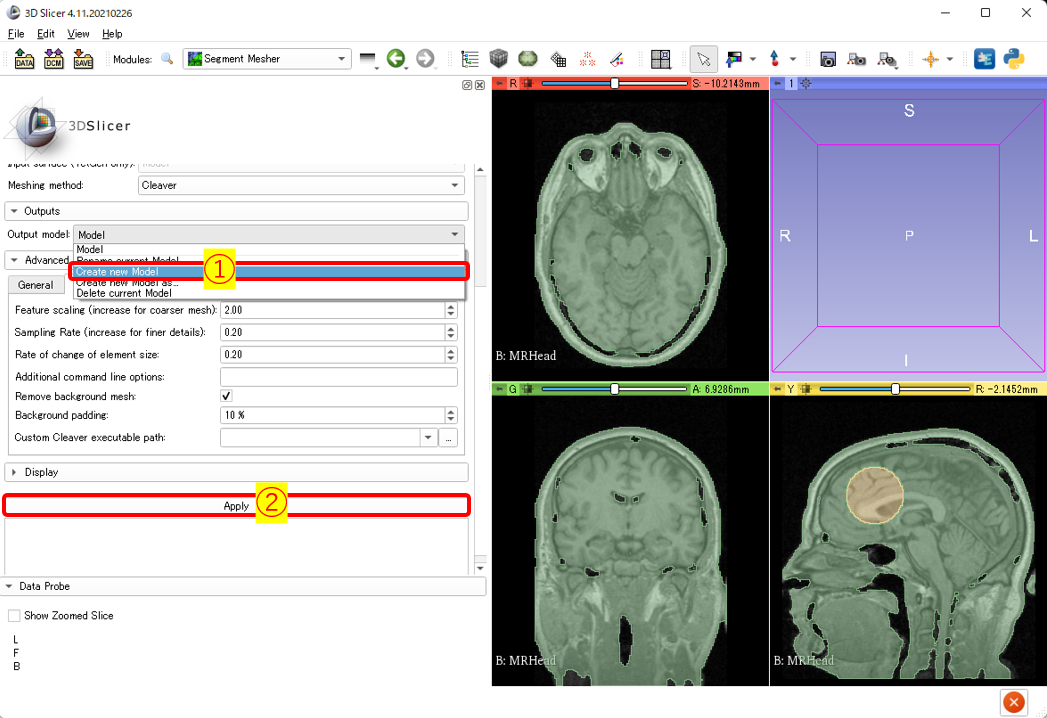 Output ModelにCreate new Modelを設定し、Applyをクリックすると、メッシュ生成が開始します。
