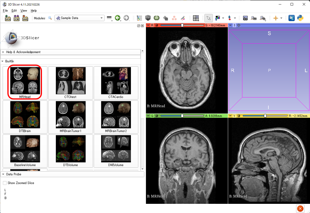 次に、Download Sample Dataモジュールを開き、下図に示すように、MRHeadを選択し、頭部のデータを読み込みます。