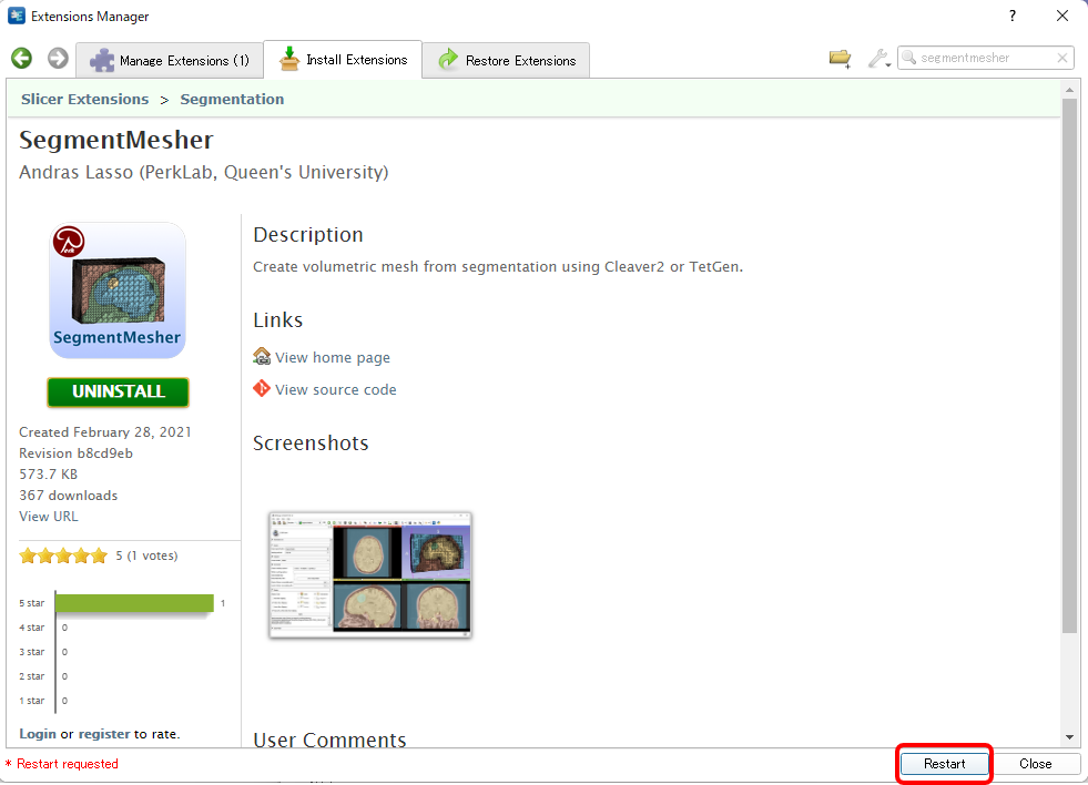 インストールを実際に反映させるために、Restartボタンをクリックし、3D Slicerを再起動する必要があります。