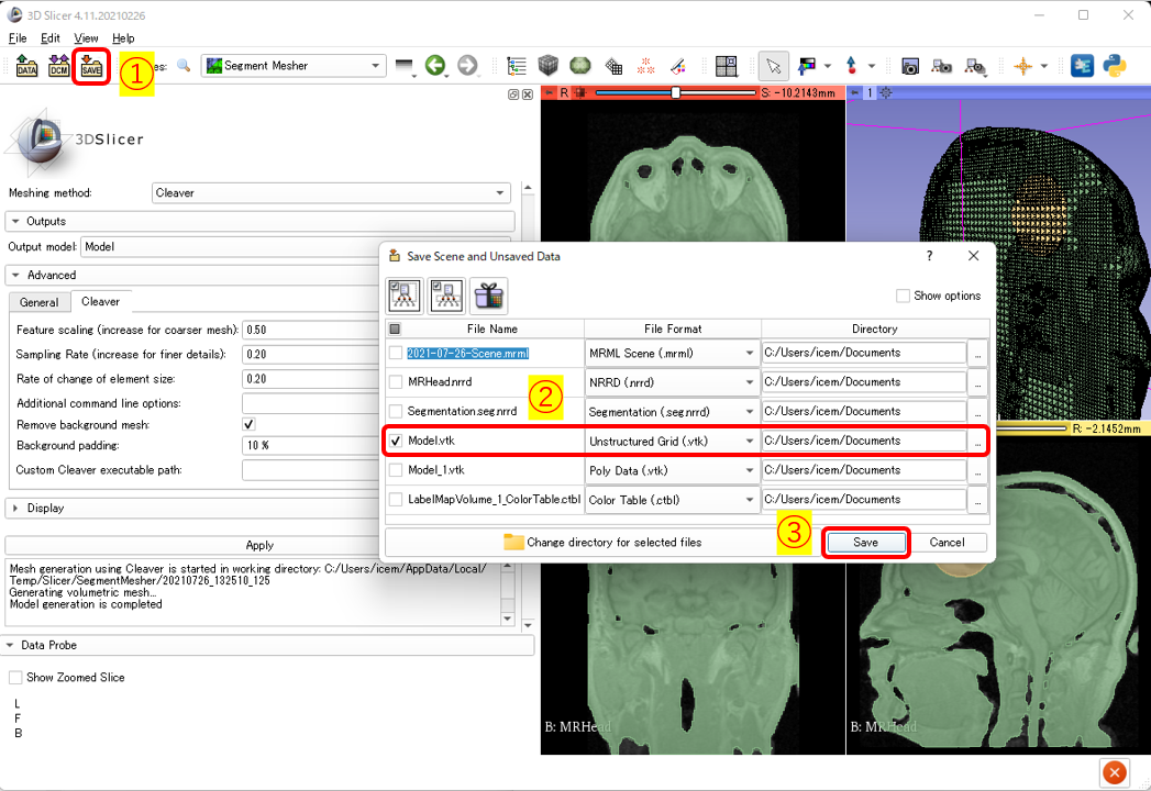 メッシュを作成する1つの方法として、医療画像から形状を三角形メッシュで抽出してから、STL形式などで出力し、 それに対して、汎用メッシャーでメッシュを作成する方法がよく使用されます。
