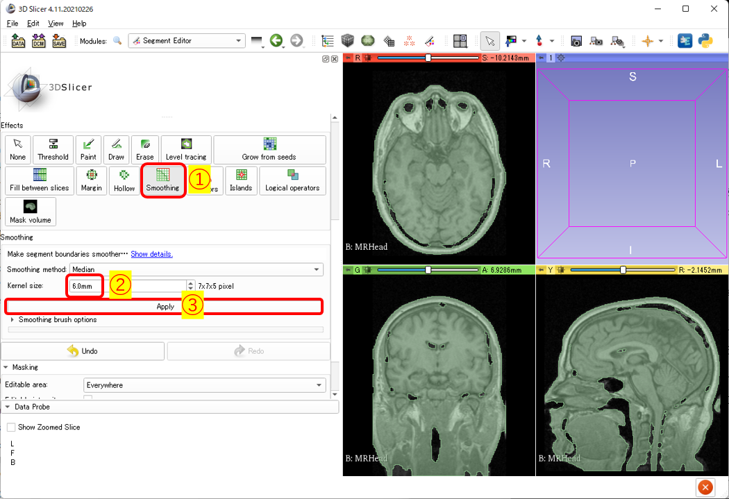 続けて、Smoothingエフェクトを使用して、セグメントにスムージングを掛けます。 kernel sizeには、6mmを設定し、Applyしましょう。
