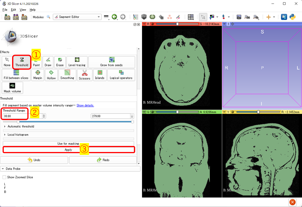 Thresholdエフェクトを使用して、初期のセグメンテーションを行います。 Threshold Rangeの下限に30を設定し、Applyすると下図のように、セグメンテーションされることが確認されます。