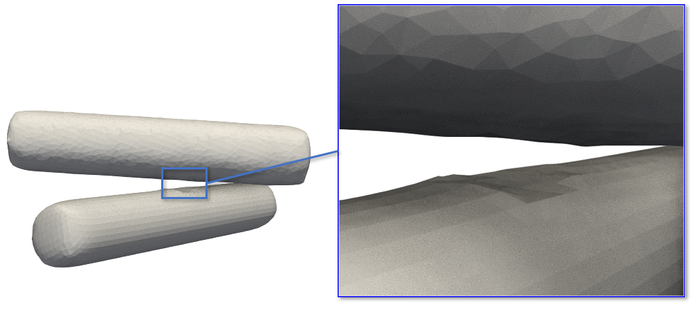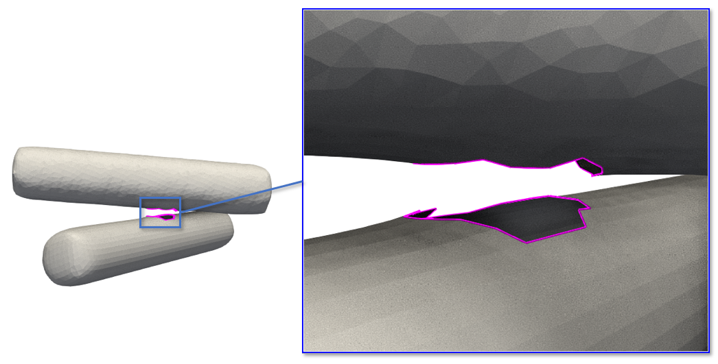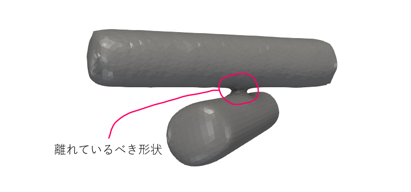 例えば、3次元画像のピクセル幅より短い距離にある形状間はつながっているべきではないのに、 下図のようにつながってしまうことがあります。