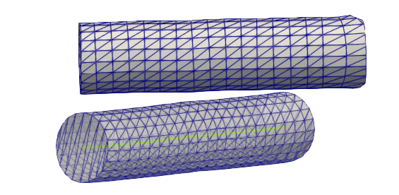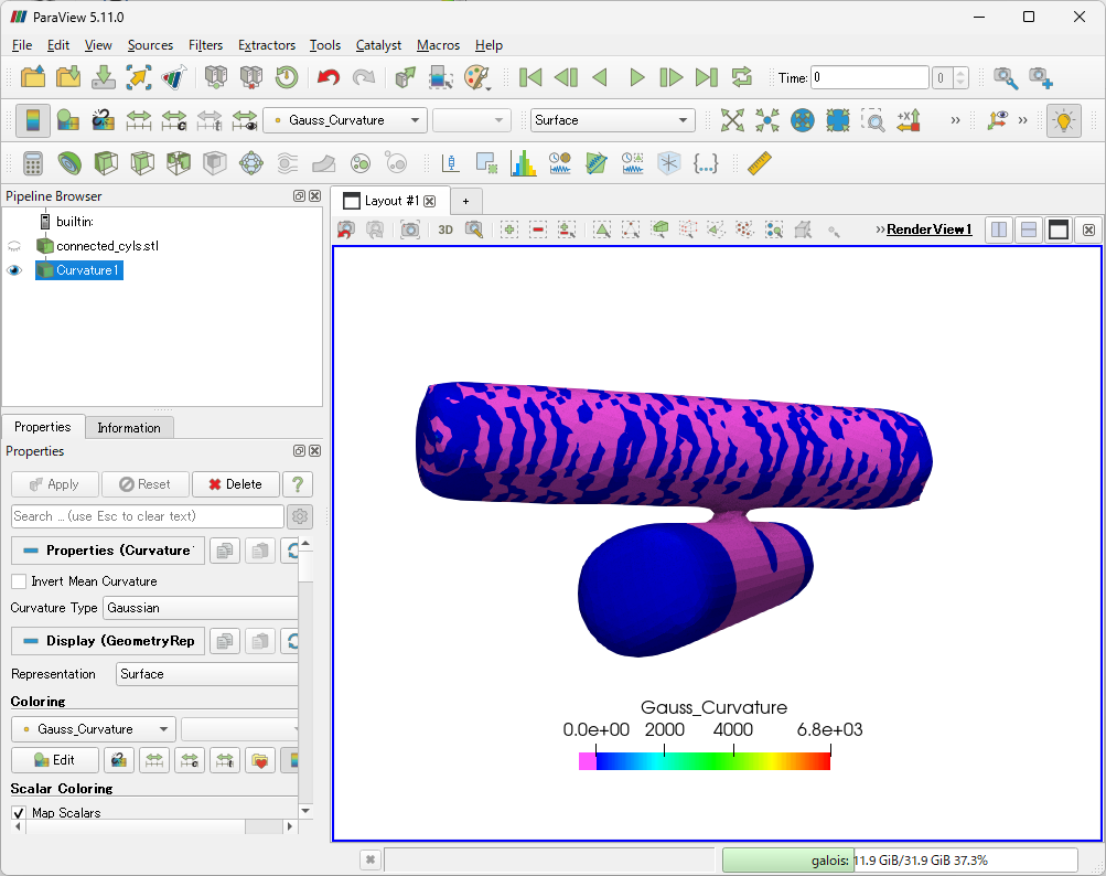 ここでは、ParaViewのCurvatureフィルターを使用して、先ほどのつながった円柱形状のGauss曲率を描画してみましょう。