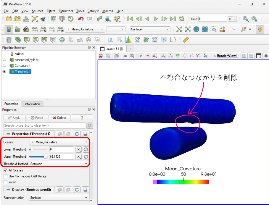 さらに、ParaViewのThresholdフィルターを使用しますと、下図のように、 負の平均曲率の領域を削除することができます。