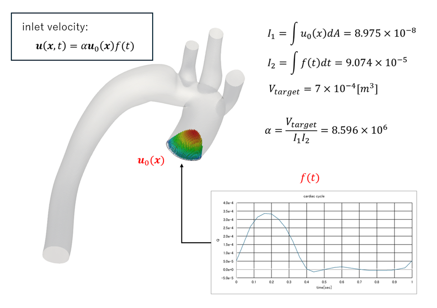血液は脈動しているがこれは流量の経時変化から時間変動パターンを知ることができる。 流入境界の流速$\mathbf{u}(\mathbf{x},t)$は次式で表されると仮定する。