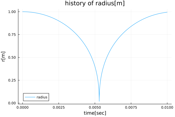 xlabel="time[sec]", ylabel="r[m]", label="radius" )