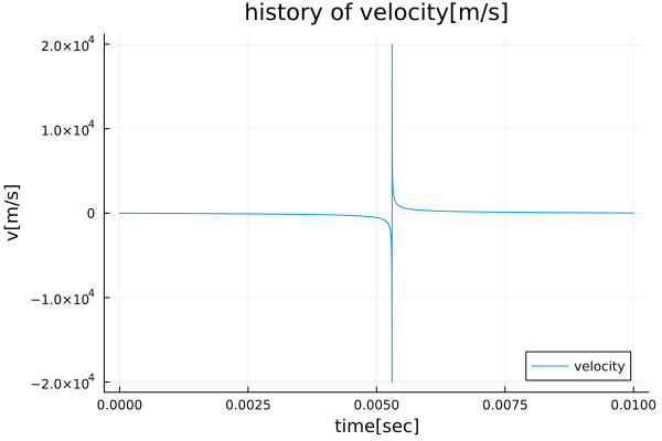 p2 = plot(times, velos, title="history of velocity[m/s]",